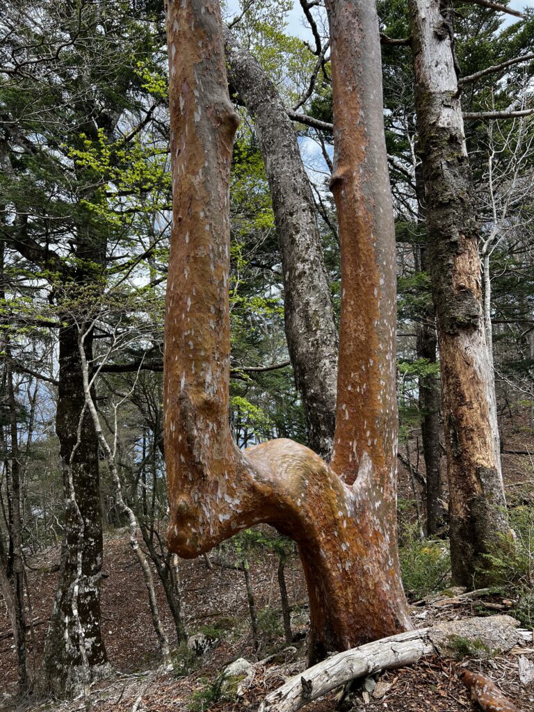 沢口山から先もひたすら緩やかな快適なトレイルが続く。以前水窪側から黒法師岳に入った際にも沢山生えていたヒメシャラの木が目立つようになってきた。樹皮はツルツルスベスベ、触るとひんやりして気持ちが良い木だ。