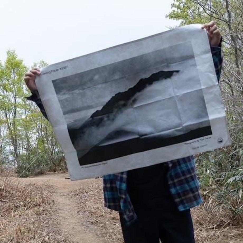 利便性とデザイン性を両立しているのが特徴で、従来の「地面に敷くだけのグラウンドシート」から脱却したアイテムです。目を引くモノクロのプリントはyuya osawaさんの荒川岳の写真です。山に行けない日はこのタイベックシートを持ってピクニックもいいですね。