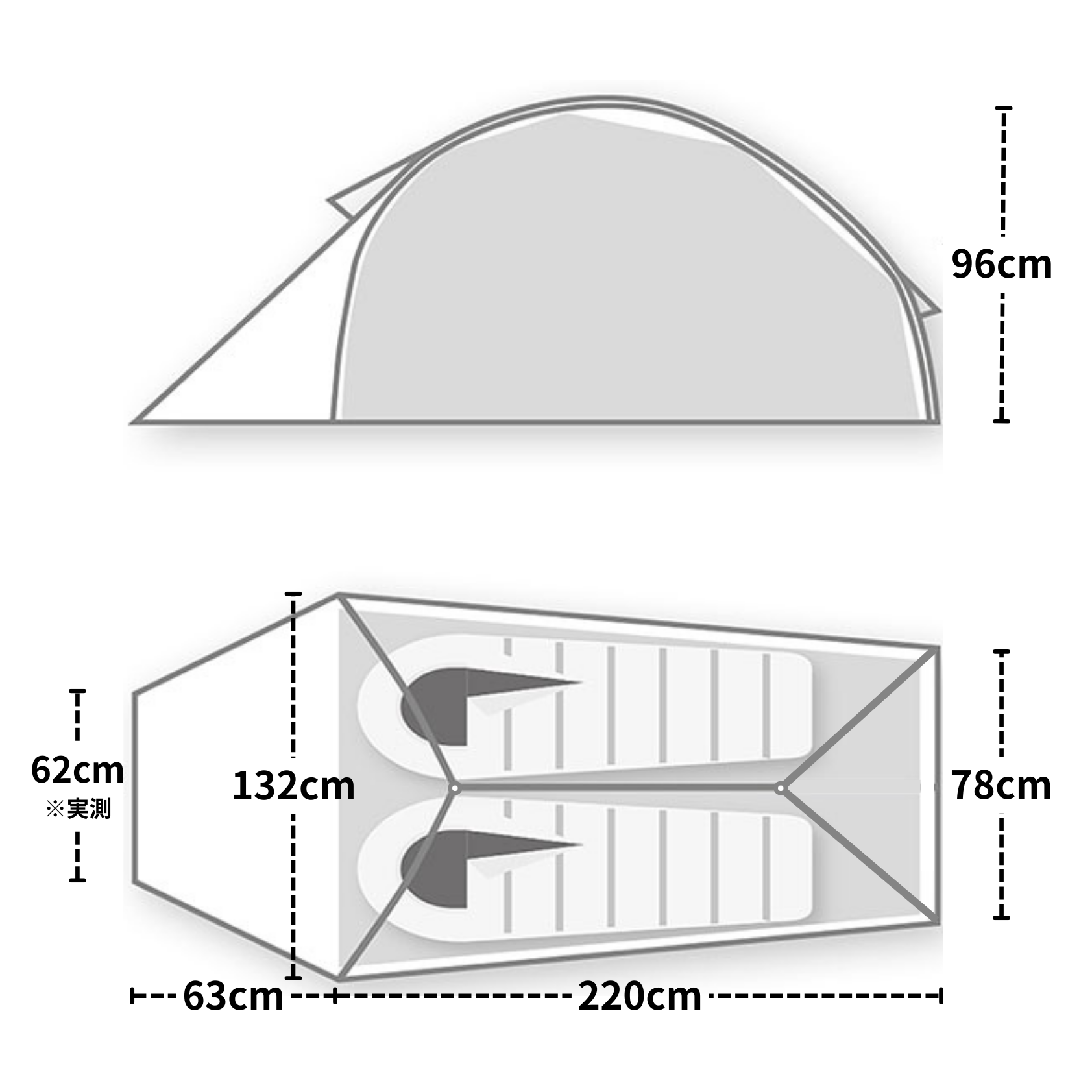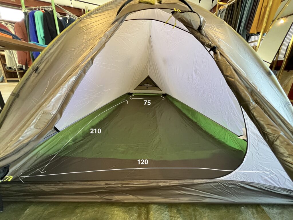 室内のサイズは実測で全長が210cm、幅は入口側120cm、足元側75cmです。172cmの店主がソロで横になっても余裕があります。2人だと荷物のことを考えると多少窮屈。前室が広いので、不要な荷物は防水のスタッフサック入れて前室に置くのがオススメ。