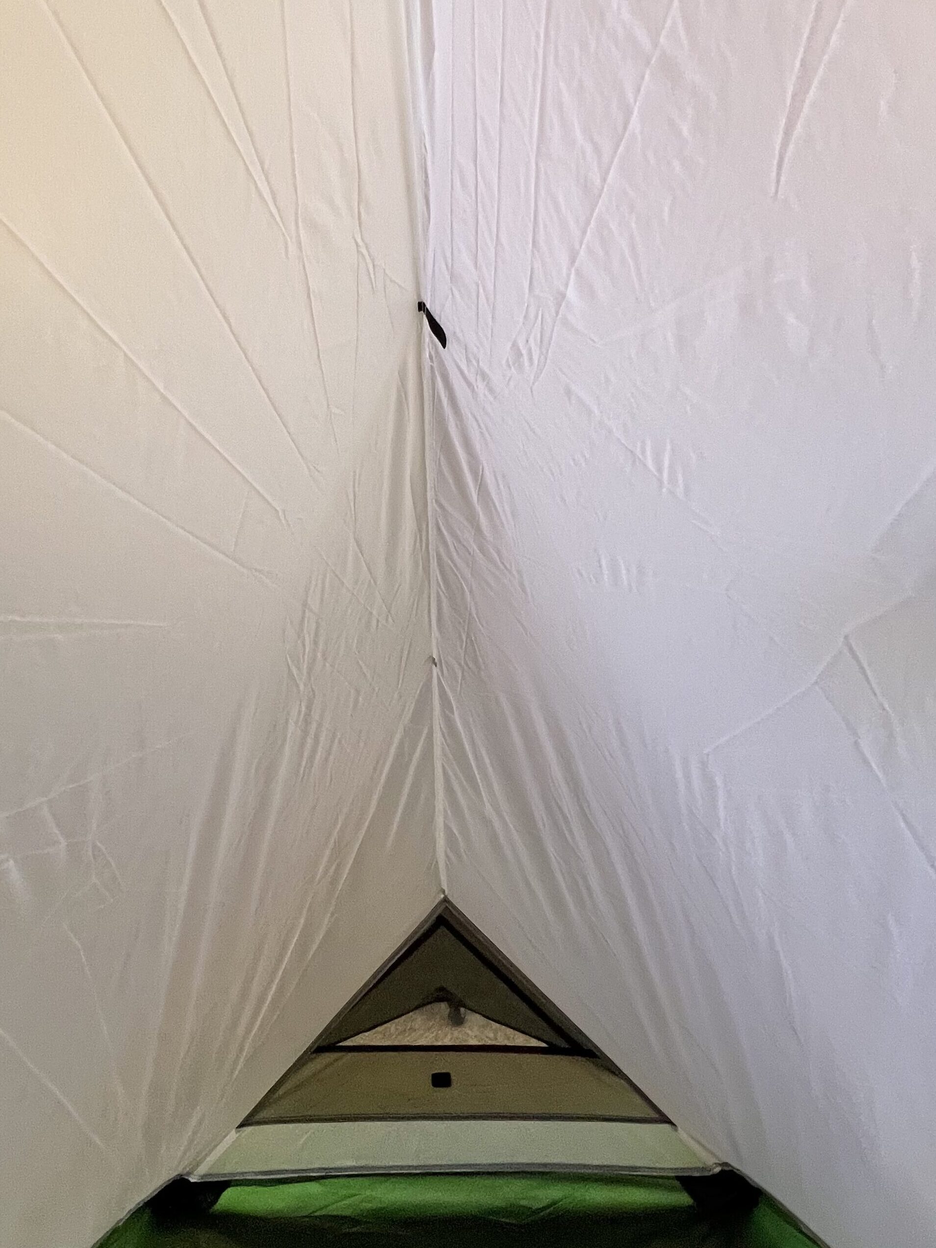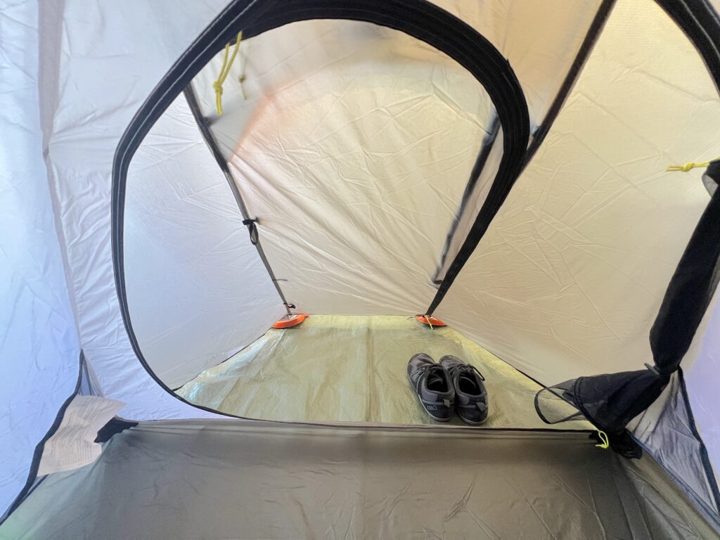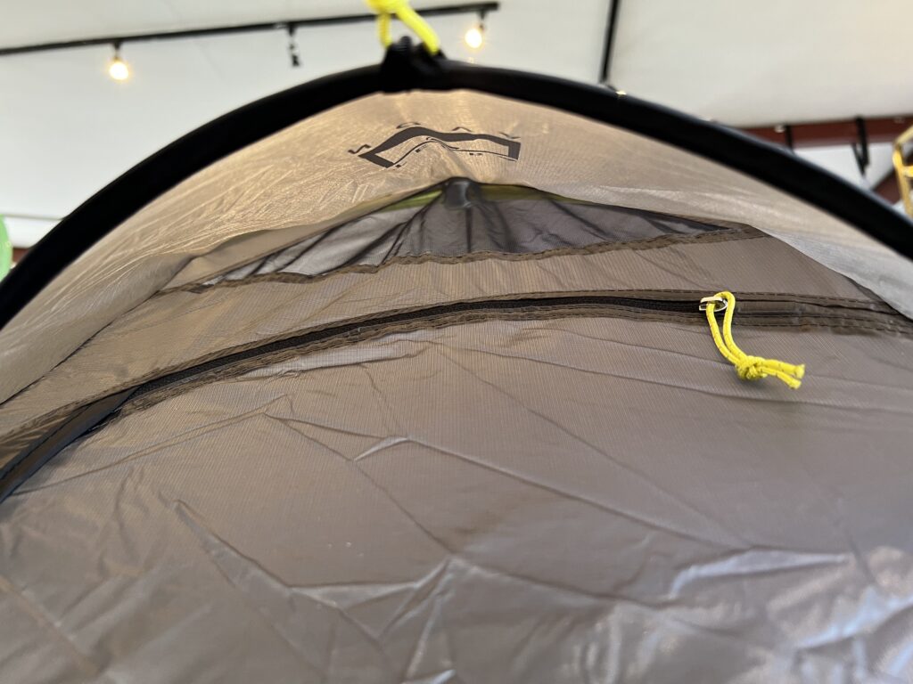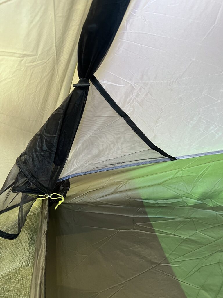入口左右には小さなメッシュポケットがついています。天井には一箇所ループがあり、物干しは厳しいですがヘッドライト等をぶら下げることができます。