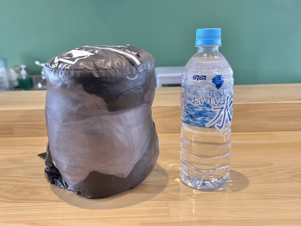 極薄の生地なのでコンプレッションすることでかなりコンパクトになります。(実際はもう少しコンプレッションできます。)