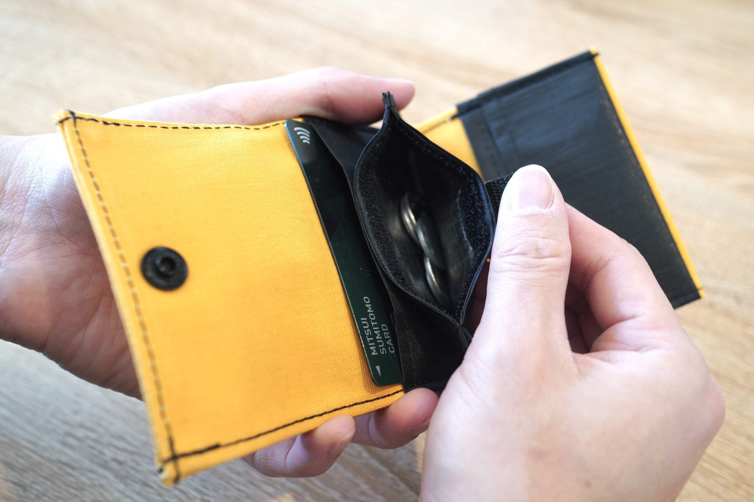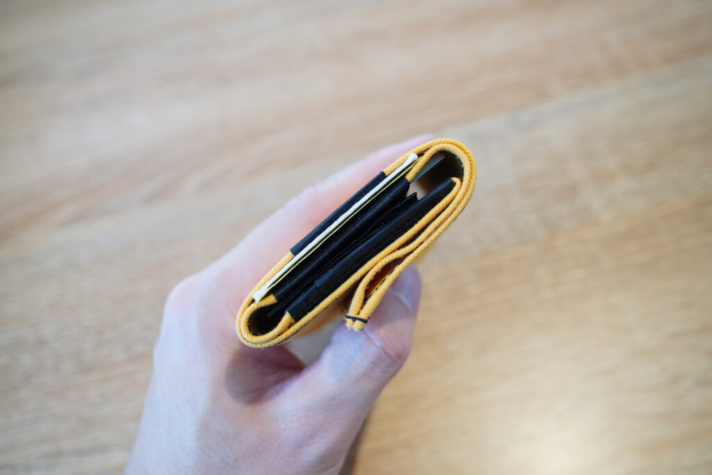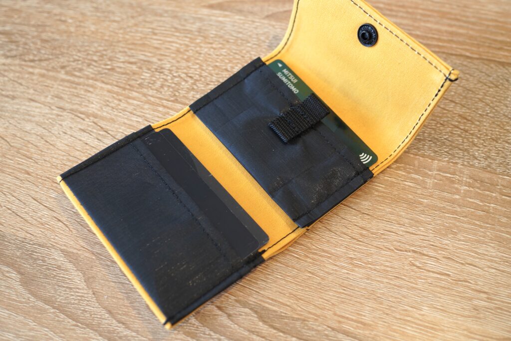 ベルクロタイプのコインケースは縫い方が工夫されていて大きく開くので、視認性がよく中身が取り出しやすいです。カードスロットとコインケースの素材は2.92ozのDCFを使用。伝統的な帆布と近代的なDCFを組み合わせることでコンパクトさを実現しています。