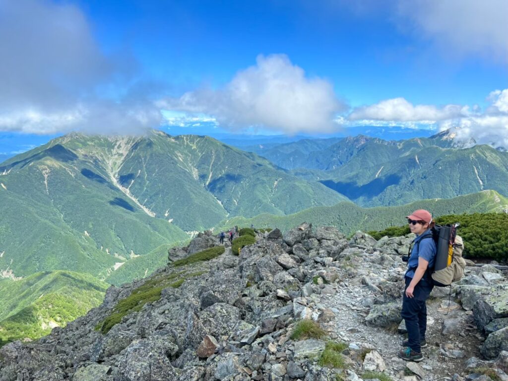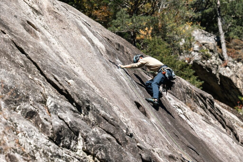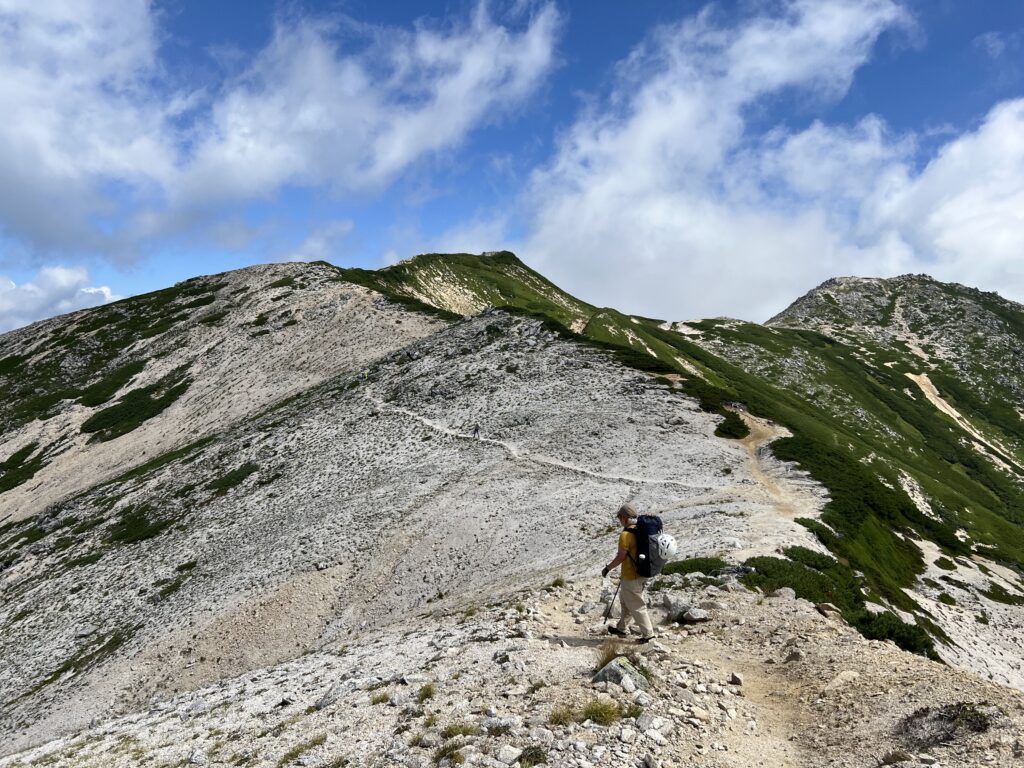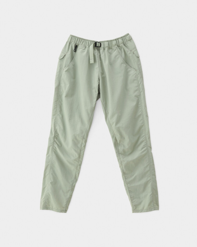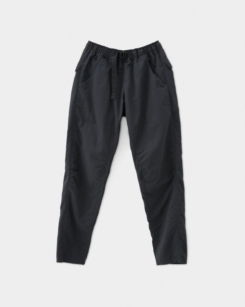 タスランナイロンはつるりとハリのある質感で安心感があるのですが、汗をかくと肌にやや張り付いて膝が上げにくいことがありました。近年夏場はアルプスでも暑いので、5-Pocket Pantsだとちょっと歩きづらいと思うこともありました。ワイドパンツを履くようになって、程よく空気を含む肌離れのよさと足上げのしやすさに夏場のハイキングがだいぶ快適になりました。冬の低山も中にタイツを穿いても窮屈感がなくてよいです。体のシルエットが出すぎないのも嬉しいところ。