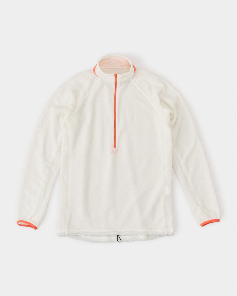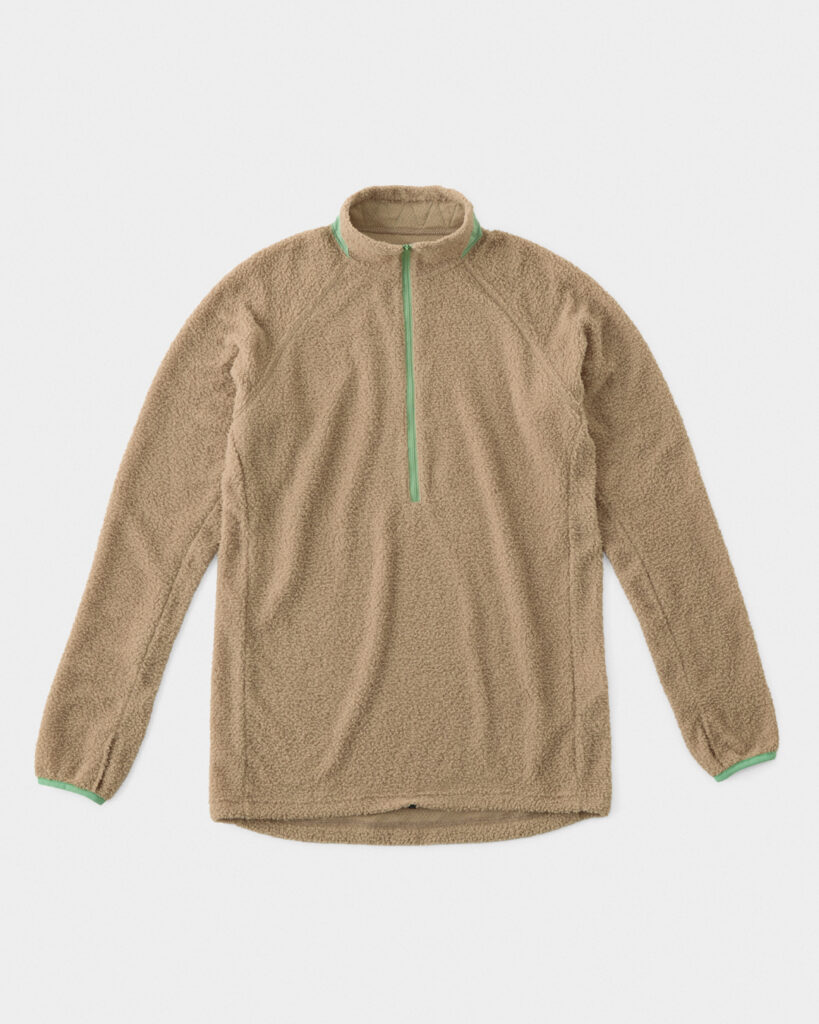 速乾性に優れ、程よい通気性のある生地プリマロフト・アクティブエボルブ(100g/㎡)を使用しており、行動中は適度に熱を逃がしつつ、ヒートアップ時には胸元のジッパーでガバっと換気します。