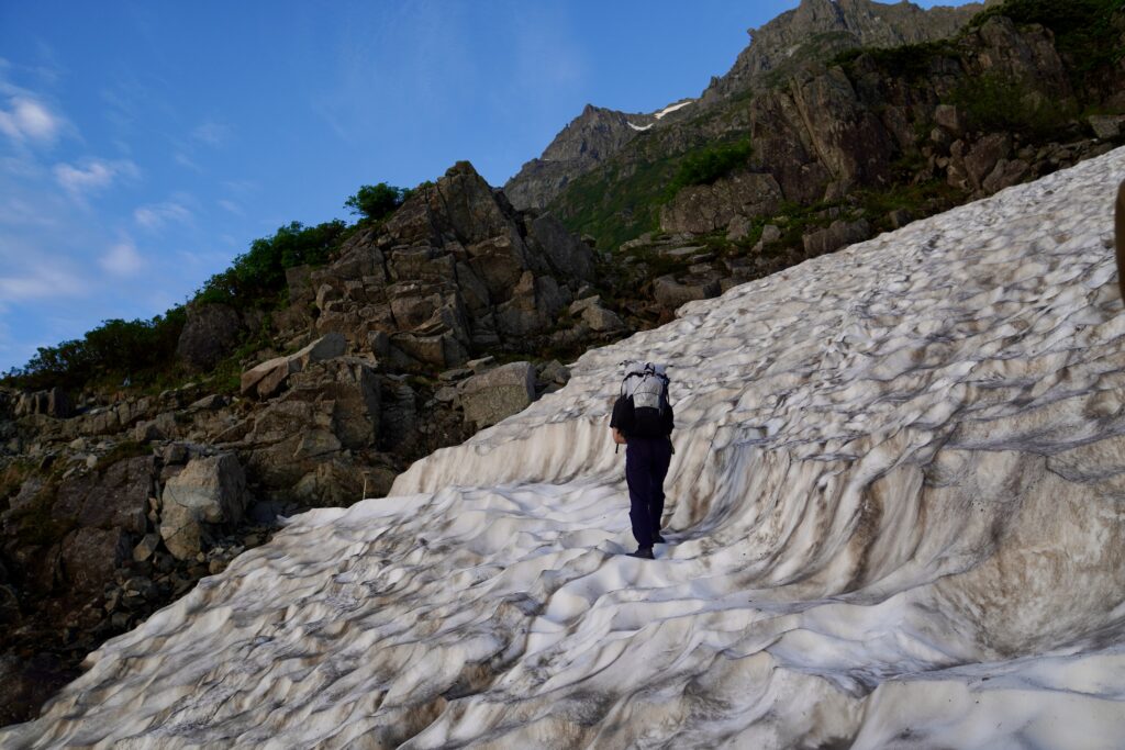 春先や秋といった冷え込む時期のテント泊や日帰りの雪山ハイキングで出番の多いTHREE。ロールトップながらジッパータイプなので荷物の出し入れがしやすく、大きなフロントポケットも使い勝手が良いです。フロントポケットはマチがしっかりあるので、ヘルメットやわかんもすっぽり収納できます。MIMIと比較して、容量はもちろんバックパック自体にハリ(剛性感)があり、形が崩れにくく初心者でもパッキングしやすいでしょう。また、ピッケルやスノーシュー等のギアを外付けしても安定感があります。